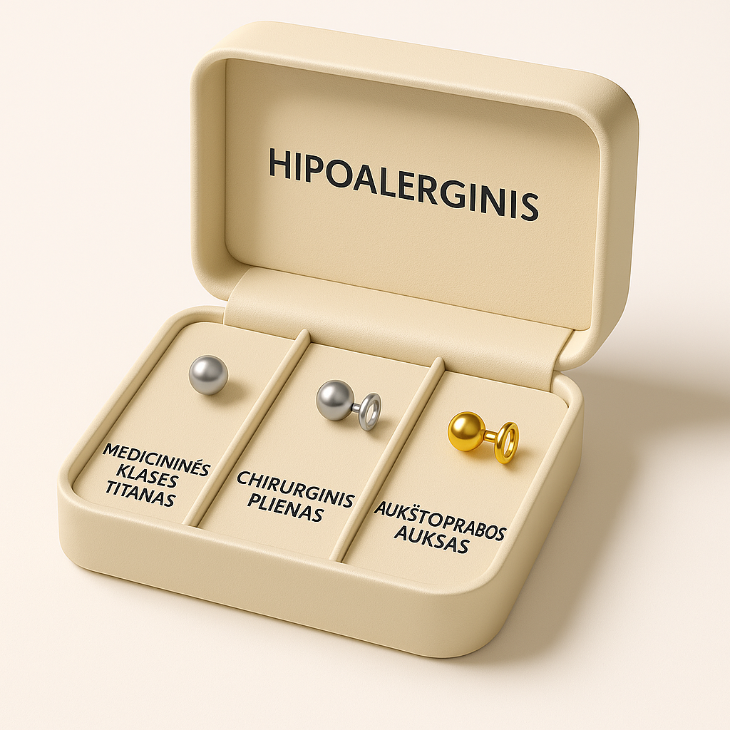 Medicininės klasės titanas, chirurginis plienas, platina ir aukštos prabos nikelio neturintis auksas yra saugiausios medžiagos jautriai odai.