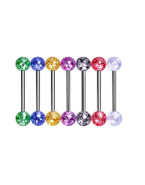 Auskarai į liežuvį, į spenelius su spalvotais blizgančiais rutuliukais.